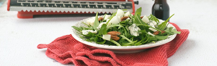 Snij roquefort in kleine blokjes en doe ze bij de rukola.