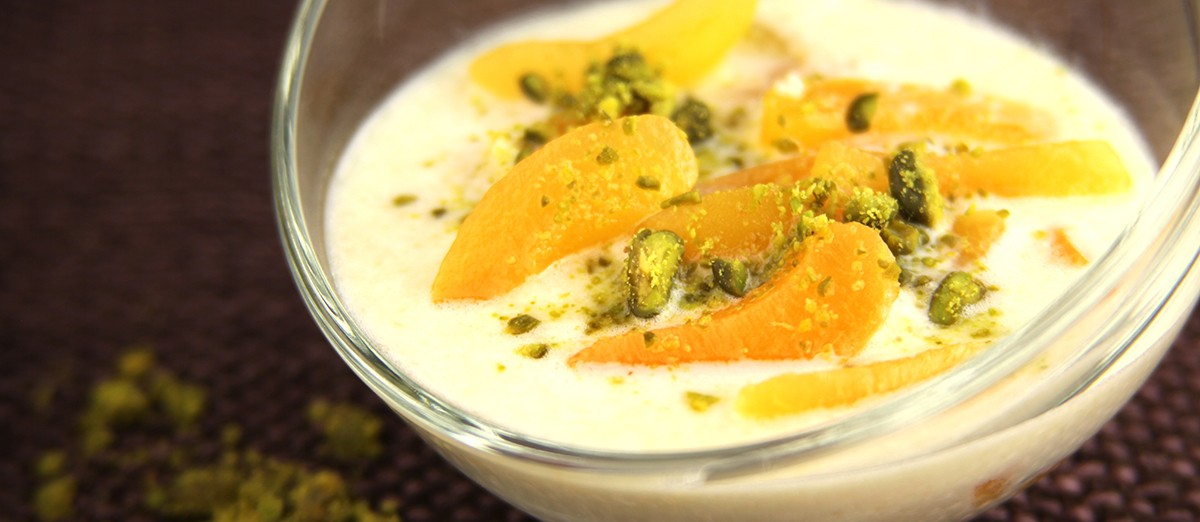 - Filter de amandelmelk met behulp van een puntzeef tot een gladde vloeistof. Giet haar in kommetjes. Voeg de abrikozen toe en bestrooi met gehakte pistachenoten.